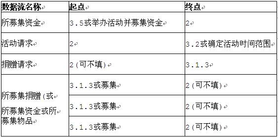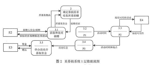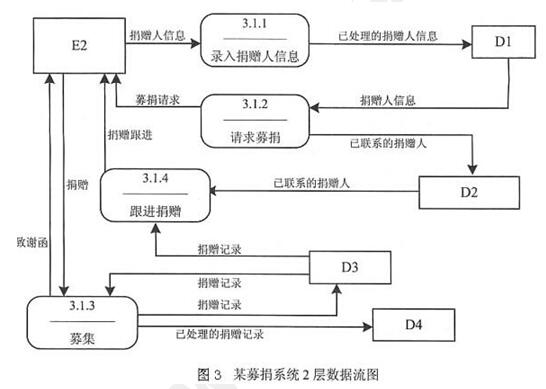 注:数据流没有次序要求;其中"2"处可以为"确定募捐需求收集所募捐赠"基于问题1的解析结果,结合如图2所示的1层数据流图中与加工P1相关的"活动时间"这一条输出数据流,查找到题干中与之相关的关键信息"(3)组织募捐活动。根据活动请求,确定活动时间范围。根据活动时间……"可知,P1的名称是"确定活动时间范围"。根据题干中给出的"根据活动时间,搜索场馆,即:向场馆发送场馆可用性请求,获得场馆可用性"等关键信息,结合图2中加工P2的输入数据流"活动时间"和"场馆可用性",以及输出数据流"场馆可用性请求"等可知,P2的名称是"搜索场馆"。由题干中给出的关键信息"然后根据活动时间和地点推广募捐活动,根据相应的活动信息举办活动……"等,结合图2中加工P3的输入数据流"活动时间和地点",以及输出数据流"活动信息"等可知,P3的名称是"推广募捐活动"。结合题干中给出的关键信息"(3)组织募捐活动。根据活动请求,确定活动时间范围",以及图1中处理2至处理3的数据流"活动请求"可知,图2中缺少了一条从处理2至处理3.2的数据流"活动请求"。依据题干中给出的"(2)确定募捐需求和收集所募捐赠(资金及物品)……获取所募集的资金和物品"、"(3)组织募捐活动……获取和处理捐赠,根据捐赠请求,提供所募集的捐赠"等关键信息可知,图2中缺少了一条从处理3.5至处理2的数据流"所募集资金"。基于题干中给出的关键信息"(3)组织募捐活动……根据捐赠请求进行募集",以及图2中处理2至处理3.1的数据流"捐赠请求"可知,图3中缺少了一条从处理2至处理3.1.3的数据流"捐赠请求"。根据图2中处理3.1至处理2的数据流"所募集物品"、"所募集资金",以及"(2)确定募捐需求和收集所募捐赠(资金及物品)……获取所募集的资金和物品"可知,图3中缺少了一条从处理3.1.3至处理2的数据流"所募集捐赠"。3、D1:捐赠人信息表 D2:已联系的捐赠人表 D3:捐赠表 D4:已处理捐赠表结合题干中给出的关键信息"录入捐赠人信息,处理后存入捐赠人信息表",以及图3中处理3.1.1的名称"录入捐赠人信息"可知,图3中数据存储D1的名称是"捐赠人信息表"。同理,根据题干中给出的关键信息"……向捐赠人发送募捐请求,并将已联系的捐赠人存入已联系的捐赠人表",以及图3中处理3.1.2的名称"请求募捐"及其输出数据流"已联系的捐赠人"等可知,数据存储D2的名称是"已联系的捐赠人表"。基于题干中给出的关键信息"……根据捐赠请求进行募集,募得捐赠后,将捐赠记录存入捐赠表",以及图3中处理3.1.3的名称"募集"及其输出数据流"捐赠记录"等可知,数据存储D3的名称是"捐赠表"。依据题干中给出的关键信息"……对捐赠记录进行处理后,存入已处理捐赠表……",以及图3中处理3.1.3的名称"募集"及其输出数据流"已处理的捐赠记录"等可知,数据存储D4的名称是"已处理捐赠表"。