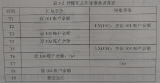 [问题2](8分)引入排它锁指令LX0)和解锁指令UX0,要求满足两段锁协议和提交读隔离级别。假设在进行余额汇总交易的同时,发生了一笔转账交易。从101账户转给104账户400元。这两笔事务的调度如表5-2所示。