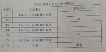 [问题3](4分)在[问题2]的基础上,引入共享锁指令LSO和解锁指令USO。对[问题2]中的调度进行重写,要求满足两段锁协议。两个事务执行的某种调度顺序如表5-3所示,该调度顺序使得汇总事务和转账事务形成死锁。请补全表中的空缺处(a)、(b)。