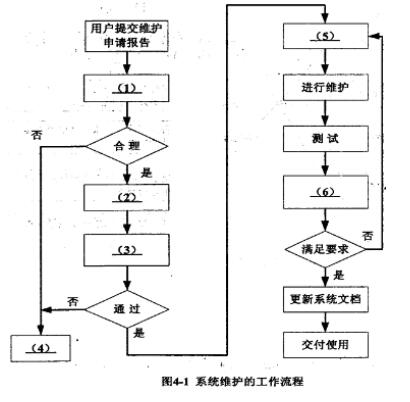 阅读以下说明,回答问题1至问题3,将解答填入答题纸的对应栏内。【说明】在信息系统的生命周期中,为了保证信息系统正常而可靠地运行,对系统进行评价,并能使系统不断得到改善和提高,通常企业需要设立专门的信息系统管理机构,负责系统的管理与维护。该机构在对信息系统进行维护时,通常要遵循一定的工作流程,建立相应的工作计划。【问题1】(6分)系统维护的工作流程如图4-1所示,请在如下备选答案A~F中选择最合适的一项填入空(1)~(6)处。备选答案:A.制定维护计划B.编制维护报告C.提交管理部门审批D.维护要求评价E.撤销申请F.用户及管理部门审核