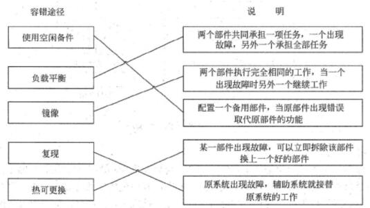 容错不是指系统可以容忍任何一种故障,而是指系统在排除某些类型的故障后继续正常运行,具有高可用性的系统应该具有较强的容错能力。 提供容错的途径有:①使用空闲备件:配置一个备用部件,平时处于空闲状态,当原部件出现错误时则取代原部件的功能;②负载均衡:使用两个部件共同承担一项任务,当其中一个出现故障时,另外一个部件承担两个部件的全部负载;③镜像:两个部件执行完成相同的工作,当其中一个出现故障时,另外一个则继续工作;④复现:也称延迟镜像,即辅助系统从原系统接受数据存在延时;⑤热可更换:某一件部件出现故障,可以立即拆除该部件并换上一个好的部件,在这个过程中系统不中断运行。
