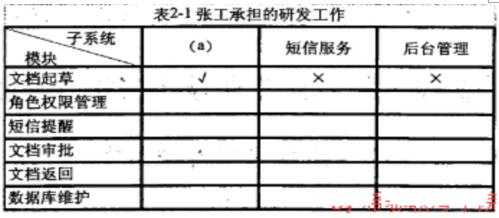 【问题2】(1)(a)文档管理 (2)根据不同企业或单位根据业务流不同,对OA系统的要求也不同。一般情况下,OA系统各子系统的功能应包括如下内容。后台管理子系统的主要功能包括下属机构和人员信息、各级管理员的身份和角色权限、数据库信息维护进行管理。文档管理子系统的主要功能包括从文档起草、文档审批、文档返回修订、文档下发等功能。 公告管理模块子系统的主要功能主要包括公告浏览、公告信息增加、公告信息修改、公告信息删除等功能。综合统计模块子系统的主要功能包括用户对未完成和已完成工作任务的查询、各下属机构任务完成得分查询以及得分排名等功能。短信服务子系统的主要功能短信编写、短信发送(群发)、短信提醒(对任务执行人进行短信提醒和催办)等功能。根据题意,张工主要承担的研发工作如表2-2所示。