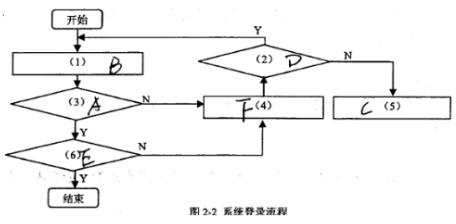请在如下备选答案A~F中,造择最合适的一项填入图2-2中的空(1)~(6)处。注:每个选项只能选1次。备选答案:A.用户是否存在B.输入用户名和密码C.显示登录失败D.登录次数