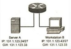参见下图的网络配置,发现工作站B无法与服务器A通信,什么故障影响了两者互通?__()__