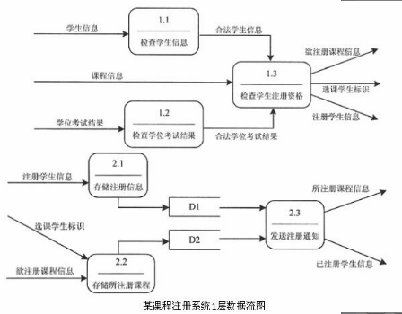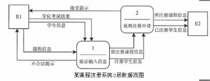 某大学欲开发一个基于Web的课程注册系统,该系统的主要功能如下。1.验证输入信息①检查学生信息:检查学生输入的所有注册所需信息。如果信息不合法,返回学生信息不合法提示;如果合法,输出合法学生信息。②检查学位考试结果:检查学生提供的学位考试结果。如果不合法,返回学位考试结果不合法提示;如果合法,检查该学生注册资格。③检查学生注册资格:根据合法学生信息和合法学位考试结果,检查该学生对欲选课程的注册资格。如果无资格,返回无注册资格提示;如果有注册资格,则输出注册学生信息(包含选课学生标识)和欲注册课程信息。2.处理注册申请①存储注册信息:将注册学生信息记录在学生库。②存储所注册课程:将选课学生标识与欲注册课程进行关联,然后存入课程库。③发送注册通知:从学生库中读取注册学生信息,从课程库中读取所注册课程信息,给学生发送接受提示;给教务人员发送所注册课程信息和已注册学生信息。现采用结构化方法对课程注册系统进行分析与设计,获得如下图所示的0层数据流图和第二个图所示的1层数据流图。