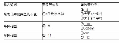 某公司需开发一套电子商务系统,为保证开发进度和开发质量,专门组建测试小组对开发的全过程进行测试。电子商务系统的报表处理模块要求用户输入处理报表的日期,日期限制在2003年1月至2006年12月,如日期不在此范围内,则显示输入错误信息。系统日期由6位数字字符组成,前4位代表年,后2位代表月。测试小组设计了等价类,如表3-1所示。请根据题目说明及表3-1,填补空9~12。表3-1报表日期输入条件等价类表