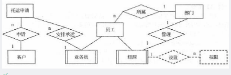 5、根据问题描述,补充四个联系、联系的类型,以及实体与子实体的联系,完善图2-1所示的实体联系图。6、根据实体联系图,将关系模式中的空(a)~(d)补充完整。分别指出部门、员工和安排承运关系模式的主键和外键。7、若系统新增需求描述如下:为了数据库信息的安全性,公司要求对数据库操作设置权限管理功能,当员工登录系统时,系统需要检查员工的权限。权限的设置人是部门经理。为满足上述需要,应如何修改(或补充)图2-1所示的实体联系图,请给出修改后的实体联系图和关系模式。
