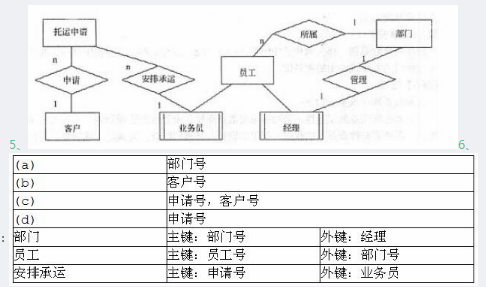 某物流公司为了整合上游供应商与下游客户,缩短物流过程,降低产品库存,需要构建一个信息系统以方便管理其业务运作活动。[需求分析结果]5物流公司包含若干部门,部门信息包括部门号、部门名称、经理、电话和邮箱。一个部门可以有多名员工处理部门的日常事务,每名员工只能在一个部门工作。每个部门有一名经理,只需负责管理本部门的事务和人员。6员工信息包括员工号、姓名、职位、电话号码和工资;其中,职位包括:经理、业务员等。业务员根据托运申请负责安排承运货物事宜,例如:装货时间、到达时间等。一个业务员可以安排多个托运申请,但一个托运申请只由一个业务员处理。7客户信息包括客户号、单位名称、通信地址、所属省份、联系人、联系电话、银行账号,其中,客户号唯一标识客户信息的每一个元组。每当客户要进行货物托运时,先要提出货物托运申请。托运申请信息包括申请号、客户号、货物名称、数量、运费、出发地、目的地。其中,一个申请号对应唯一的一个托运申请;一个客户可以有多个货物托运申请,但一个托运申请对应唯一的一个客户号。[概念模型设计]根据需求阶段收集的信息,设计的实体联系图和关系模式(不完整)如图2-1所示。[关系模式设计]部门(部门号,部门名称,经理,电话,邮箱)员工(员工号,姓名,职位,电话号码,工资,(a))客户((b),单位名称,通信地址,所属省份,联系人,联系电话,银行账号)托运申请((c),货物名称,数量,运费,出发地,目的地)安排承运((d),装货时间,到达时间,业务员)