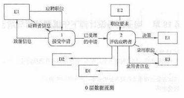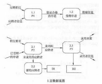 某公司欲开发招聘系统以提高招聘效率,其主要功能如下:1接受申请验证应聘者所提供的自身信息是否完整,是否说明了应聘职位,受理验证合格的申请,给应聘者发送致谢信息。2评估应聘者根据部门经理设置的职位要求,审查已经受理的申请;对未被录用的应聘者进行谢绝处理,将未被录用的应聘者信息存入未录用的应聘者表,并给其发送谢绝决策;对录用的应聘者进行职位安排评价,将评价结果存入评价结果表,并给其发送录用决策,发送录用职位和录用者信息给工资系统。现采用结构化方法对招聘系统进行分析与设计,获得如图1-1所示的顶层数据流图、图1-2所示0层数据流图和图1-3所示1层数据流图。