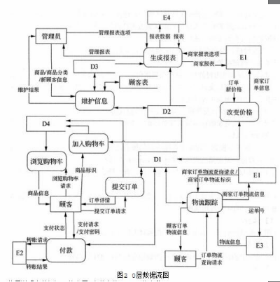 某电子商务系统采用以数据库为中心的集成方式改进购物车的功能,详细需求如下:1.加入购物车。顾客浏览商品,点击加入购物车,根据商品标识从商品表中读取商品信息,并更新购物车表。2.浏览购物车。顾客提交浏览购物车请求后,显示出购物车表中的商品信息。3.提交订单。顾客点击提交订单请求,后台计算购物车表中商品的总价(包括运费)加入订单表,将购物车表中的商品状态改为待付款,显示订单详情。若商家改变价格,则刷新后可看到更改后的价格。4.改变价格。商家查看订购自家商品的订单信息,根据特殊优惠条件修改价格,更新订单表中的商品价格。5.付款。顾客点击付款后,系统先根据顾客表中关联的支付账户,将转账请求(验证码、价格等)提交给支付系统(如信用卡系统)进行转账;然后根据转账结果返回支付状态并更改购物车表中商品的状态。6.物流跟踪。商家发货后,需按订单标识添加物流标识(物流公司、运单号);然后可根据顾客或商家的标识以及订单标识,查询订单表中的物流标识,并从相应物流系统查询物流信息。7.生成报表。根据管理员和商家设置的报表选项,从订单表、商品表以及商品分类表中读取数据,调用第三方服务CrystalReports生成相关报表。8.维护信息。管理员维护(增、删、改、查)顾客表、商品分类表和商品表中的信息。现采用结构化方法实现上述需求,在系统分析阶段得到如图1所示的顶层数据流图1和图2所示的0层数据流图。