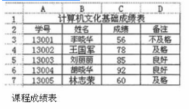 用Excel制作的学生计算机文化基础课程成绩表如下图所示。若学生成绩小于60分,需要在对应的备注栏填“不及格”;若学生成绩大于59分,小于79,需要在对应的备注栏填“及格”;否则在对应的备注栏填“良好”。实现时,可在D3单元格输入“=IF((),”不及格”,(请作答此空))”,并向下拖动填充柄至D7单元格即可。