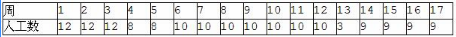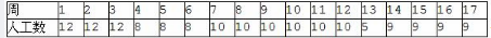 至此,各周所需人工数的最大差值为7,符合题目要求,调节完毕。