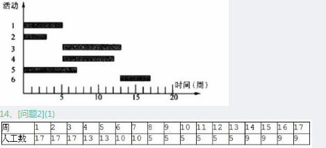 13、[解析] [问题1]甘特图也称条形图,是一个二维平面图。在用于描述项目进度和项目计划时,纵向表示活动内容,横向表示活动时间,以活动开始时间起到活动结束时间止,横道线的长度表示了该活动的持续时间。本题按照表中给出的参数,以6项活动的最早开始时间起,按照持续时间的长度画图即可。14、[解析] 以[问题1]所描绘的甘特图为基础,逐次依照横坐标周数序数,按周累加纵坐标对应各活动的人工数,即得每周所需人工数。依照1至17周每周所需人工数,查到周需人工数最大值为17,最小值为3,其差为14,即周人工数的最大差值为14。15、[解析] 由该项目的工作安排甘特图可以粗略看出,活动5与其他活动的相关性如下:与活动1、2并行开始,使得前1~3周人工数需求为最大值17,对其合理调整将不会影响整个工期;与活动3、4交错开始,但不存在前后序的逻辑关系;与活动6可能有前后序的逻辑关系,但这两个活动间的自由时差为6。综合题目给出的该项目各活动时间与人工需求参数表进行相应调节。首先将活动5推后5周,使得活动1完成后再开始活动5,这样各周所需人工数如下表: