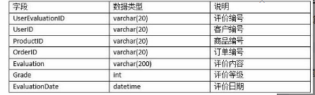 为了扩展业务,某商务公司在2012年开发了一套基于ASP.NET+SQLServer的电子商务网站,在网站运行过程中,逐渐发现了一些问题和漏洞,其中有一个严重的缺陷,缺少商品的售后评价体系,导致很多客户无法表述商品使用体会。针对这个问题,对网站进行二次开发,采用的解决方案是增加用户对商品的评价体系。为此,在数据库中增加了一张客户评价表UserEvaluation,结构如表2-1所示。
