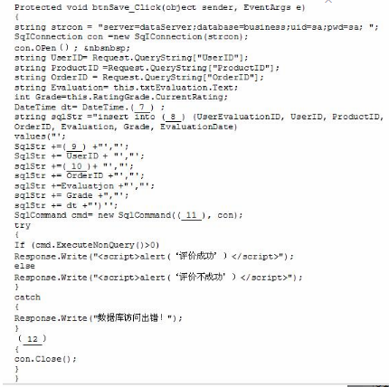 问题:2.3(6分)以下程序表示用户添加评价信息,假定数据库连接字符串正确无误,已购买商品列表页面链接到商品评价页面的URL中传递了用户编号(参数名为UserID)、商品编号(参数名为ProductID)和订单编号(参数名为OrderID)等信息,规定用户评价编号由用户编号+商品编号+订单编号依次组成,评价日期为系统当前时间,评价分数和评价内容控件名分别为RatingGrade和txtEvaluation。根据题目描述,完成以下程序:
