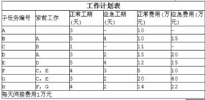总持续时间最长的线路称为关键线路,即为关键路径,因此关键路径:A→D→E→F→H。计算项目完成总工期为19天。本项目考查项目进度控制及计划优化的问题。重点为时间成本平衡法。时间成本平衡法的目标是在总成本增加最少的条件下压缩工期,使项目在最短时间完成。每项工作的工期从正常时间缩短至应急时间都有自己的单位时间和成本。正常时间是在正常条件下完成工作需要的估计时间长度;正常成本是在正常时间内完成工作的预计成本。应急时间是完成工作的最短估计时间长度;应急成本是在应急时间内完成工作的预计成本。缩短工期的单位时间和成本可用如下公式计算:(应急成本-正常成本)/(正常时间-应急时间)。具体计算如下,总工期需要缩短2天,应首先选择关键路径上的活动进行压缩,即在A、D、E、F、H五个活动中选择。比较这五个活动的单位时间赶工成本。