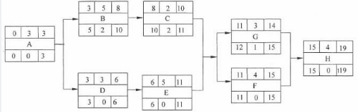 本题考查项目管理知识的应用。本问题考查双代号网络计划图的概念及解读。双代号网络图又称箭线式网络图,在此基础上进行网络图的构建。其二考查网络计划参数的概念及计算。工作持续时间是指一项工作从开始到完成的时间。工作的最早开始时间(ES)是指在其所有紧前工作全部完成后,本工作有可能开始的最早时刻。工作的最早完成时间(EF)是指在其所有紧前工作全部完成后,本工作有可能完成的最早时刻。工作的最早完成时间等于本工作的最早开始时间与其持续时间之和。工作的最迟完成时间(LS)是指在不影响整个任务按期完成的前提下,本工作必须完成的最迟时刻。工作的最迟开始时间(LF)是指在不影响整个任务按期完成的前提下,本工作必须开始的最迟时刻。工作的最迟开始时间等于本工作的最迟完成时间与其持续时间之差。工作的总时差(TF)是指在不影响总工期的前提下,本工作可以利用的机动时间。工作的自由时差(FF)是指在不影响其紧后工作最早开始时间的前提下,本工作可以利用的机动时间。对于同一项工作而言,自由时差不会超过总时差。当工作的总时差为零时,其自由时差必然为零。网络计划中各项工作的最早开始时间(ES)和最早完成时间(EF)的计算应从网络计划的起始节点开始,顺着箭线方向依次逐项计算。工作的最早开始时间等于该工作的各个紧前工作的最早完成时间的最大值,ES=max{紧前工作的EF};工作的最早完成时间等于该工作的最早开始时间加上其持续时间,EF=ES+本工作持续时间。网络计划中各项工作的最迟开始时间(LS)和最迟完成时间(LF)的计算应以项目规定或计算的工期为基准,从网络计划的终止节点,逆着箭线方向依次逐项计算。某工作的最迟完成时间等于该工作的各项紧后工作的最迟开始时间的最小值,LF=min{紧后工作的LS};最迟开始时间等于本项工作的最迟完成时间减本项工作的持续时间,LS=LF-工作的持续时间。某项工作总时差(TF)等于该工作最迟完成时间与最早完成时间之差,或该工作最迟开始时间与最早开始时间之差,TF=LF-EF或TF=LS-ES。某项工作自由时差(FF)的计算有两种情况,对于有紧后工作的工作,其自由时差等于本工作之紧后工作最早开始时间减本工作最早完成时间所得之差的最小值,FF=min{ES(紧后工作)}-EF;对于无紧后工作的工作,也就是以网络计划终点节点为完成节点的工作,其自由时差等于计划工期与本工作最早完成时间之差。任务D与任务B是并行关系。任务F是任务H的前置任务。由上面计算可知任务G的最早开始时间为11,任务C的总时差为2。本问题考查关键路径的概念和项目工期计算。在关键线路法(CPM)中,线路上所有工作的持续时间总和称为该线路的总持续时间,将网络图中所有线路的作业时间进行比较,总持续时间最长的线路称为关键线路,关键线路上的工作称为关键工作,关键线路的长度就是网络计划的总工期。