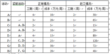 【说明】某项目由A、B、C、D、E、F、G、H活动模块组成,下表给出了各活动之间的依赖关系,以及它们在正常情况和赶工情况下的工期及成本数据。假设每周的项目管理成本为10万元,而且项目管理成本与当周所开展的活动多少无关。