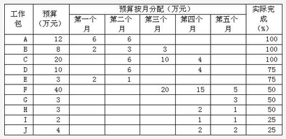 [说明]某项目由A、B、C、D、E、F、G、H、I、J共10个工作包组成,项目计划执行时间为5个月。在项目执行到第3个月末的时候,公司对项目进行了检查,检查结果如下表所示(假设项目工作量在计划期内均匀分布)。检查结果表