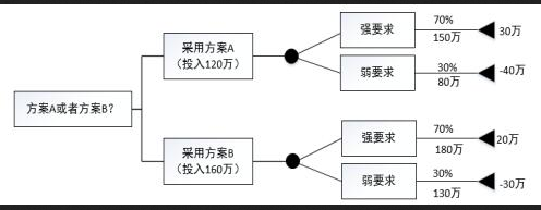 如某公司正在准备竞标一系统集成项目,为了估算项目的收益,技术总监带领风险管理团队,对项目可选的两种集成实施方案进行了决策树分析,分析图如下所示。以下说法中,正确的是()。 A.以上进行的是风险定性分析,根据分析,该公司应采用方案B