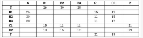 某化工集团运输表如下所示(单位:公里),从原料地S原料地运输经B1、B2、B3中转站后,可以选择C1、C2仓库,再从仓库C1、C2运输到目的地工厂 F,原料地S到目的地工厂F的最短距离是 ( ) 公里。