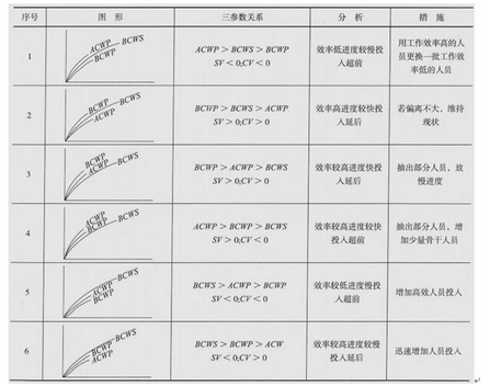 (判卷标准:如下图形,不需要说出三参数关系,只答出其所代表的效率、进度和投入等情况,并针对每幅图表所反映的问题,说清调整措施即得分。)