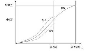 一个预算100万的项目,为期12周,现在工作进行到第八周。已知成本预算(BCWS)是64万,实际成本(ACWP)支出是68万,挣值(BCWP)为54万。