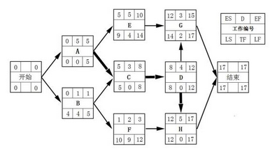 关键路径为ACDH,项目完成至少需要17周。在有外部限制条件下的计算如下:E作业具有4周的总时差,延迟3周后G作业开始,会导致G作业的最早开始时间变为第13周,关键路径不会发生变化。F作业具有9天的总时差,延迟5周后H作业仍然为第12周开始(H作业的最早开始时间选F和D作业最早结束时间的最大值12),因此也不会导致关键路径的变化。综上所述:在有外部限制条件的情况下,关键路径仍为ACDH,项目完成至少需要17周。