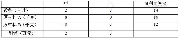 <p>某工厂计划生产甲、乙两种产品。生产每套产品所需的设备台时、 A、B两种原材料和可获取利润以及可利用资源数量如下表所示。该