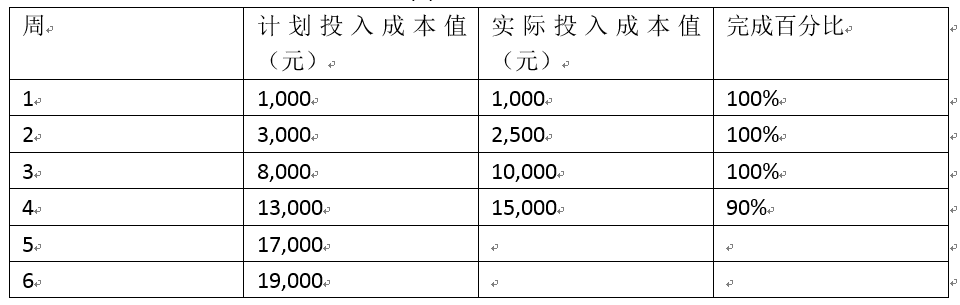<p>某信息系统集成项目计划6周完成,项目经理就前4周的项目进展情况进行分析和汇报情况如下,项目的成本执行指数CPI为()。