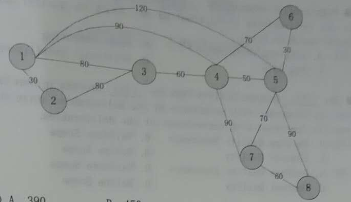 工程师小张需要完成图中所有区域的巡检工作,图中圆圈代表巡检地点,两点之间的连接线为可行的交通路径,连接线上所标识的数字为两点之间所需的交通费用(单位:元),从地点1开始完成巡检(不需按数字顺序也无需返回起点)所需的最少交通费用为( )元。