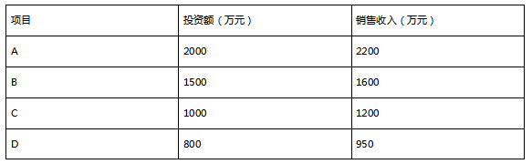 下表列出 A、 B、 C、D四个项目地投资额及销售收入根据投资回报率评估,应该选择投资( )。