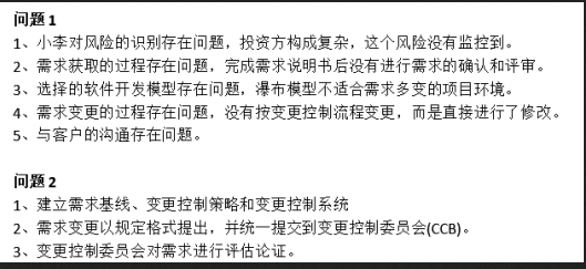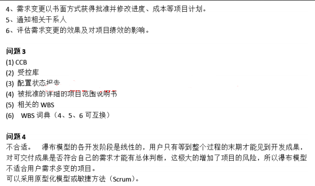 阅读下列说明,回答问题1至问题4,将解答填入答题纸的对应栏内。 【说明】 项目经理小李负责了一个新的项目,该项目的内容是为某市开发一套智慧城市公共综合信息服务平台。项目启动阶段,甲方仔细查看了小李提交的项目实施方案,提出由于该项目的投资方构成复杂,项目需求不清晰,希望项目组能想办法解决这个问题。 小李向公司申请了几名经验丰富的系统分析师,加强需求分析阶段的工作。经过较为充分的需求调研,形成了初步的需求说明书。小李认为需求分析工作较为详细,按照公司常用的软件开发生命周期模型,选择了瀑布模型进行开发。 在编写概要设计和详细设计说明书的过程中,客户方提供了几处需求的修改要求。由于其工作量不大,小李直接安排系统分析师按客户的要求进行了修改。在编码阶段后期,由于客户的投资方发生了变化,新的投资方采用了新的运营模式,导致需求发生较大变化,由于前期甲方已经强调过项目需求特点和要求,小李只能接受客户新的变更要求。在执行变更的过程中,项目组发现新的需求将导致系统架构的更改,经过评估该变更将使项目延期。 【问题1】(5分) 请分析该项目在整个过程中存在哪些主要问题? 【问题2】(7分) 请说明项目范围(需求)变更控制流程。 【问题3】(6分) 请将下面(1)~(6)处的答案填写在答题纸的对应栏内。 每项记录在册的变更请求都必须由(1)批准或否决。 变更结束后,形成新的项目极限并纳入到配置库的(2)库中,这时配置管理员应向项目组成员提交一份(3)报告。 (4)、(5)、(6)构成了项目的范围基准。 【问题4】(3分) 小李选择瀑布模型作为生命周期模型是否合适?如合适,请说明理由;如不合适,请说明理由,并给出合适的生命周期模型。