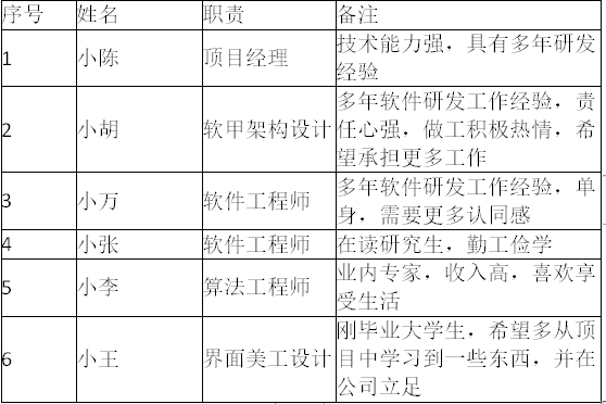 2018年7月某信息系统公司中标当地司法部门语音转写项任命小陈为项目经理。小陈组建了项目组,制定了项目范围说明书,并获得了客户确认。为了激励成员,小陈向公司申请了项目奖金。项目进行过程中,小陈发现人员紧张,请来在读研究生小张协助软件研发工作,并对其进行了培训。项目组成员如下: