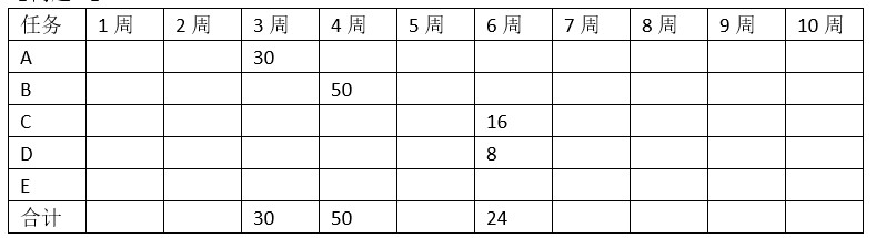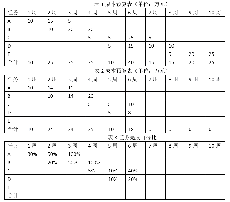 某公司完成一个工期10周的系统集成项目,该项目包含ABCDEF五项任务,项目经理制定了成本预算表(如表1)执行过程中记录了每个时段项目的执行情况(如表2、表3)。