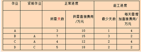 某工程包括 A、 B、 C、D 四个作业,其衔接关系、正常进度下所需天数和所需直接费用、赶工进度下所需的最少天数和每天需要增加的直接费用见下表。该工程的间接费用为每天 5万元。据此,可以估算出完成该工程最少需要费用(请作答此空 )万元,以此最低费用完成该工程需要()天。