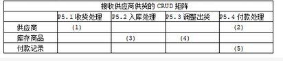系统建模过程中为了保证数据模型和过程模型的一致性,需要通过数据过程-CRUD矩阵来实现数据模型和过程模型的同步,请在下表所示CRUD矩阵(1)~ (5)中填入相关操作。