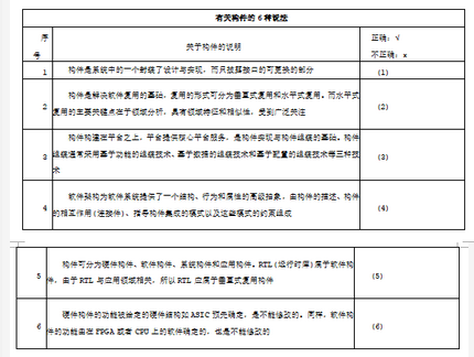 由于该公司已具备大量的成熟软件,王工程师此次的主要工作就是采用遗留工程(LegacyEngi neering)方法,将具有潜在复用价值的软件提取出来,得到可复用的构件。因此,在设计软件时与原开发技术人员产生了重大意见分歧,主要分歧焦点在于大家对构件概念理解上的差异。请根据你对构件的理解,判断下表给出的有关构件的说法是否正确。