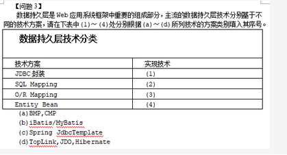 数据持久层是根据分层思想,通过建立逻辑数据操作接口,采取一定的对象/关系映射策略,隐藏数据库访问代码细节,向业务开发人员提供透明的对象持久化操作机制。 能够为项目开发带来的好处:(1)分离业务逻辑层和数据层,降低两者之间的耦合;(2)通过对象/关系映射向业务逻辑提供面向对象的数据访问;(3)简化数据层访问,隐藏数据库链接、数据读写命令和事务管理细节。 项目组应该采用Hibernate框架。 原因:(1)Hibernate支持多种不同类型数据库,满足项目组数据库移植需求; (2)Hibernate相对于iBatis减少了SQL语句开发的工作量;(3)iBatis生成的PO是扁平化的,无法像Hibernate一样支持对象的继承和聚合等立体化关系。 答案:(1)(c) (2) (b) (3) (d) (4) (a)