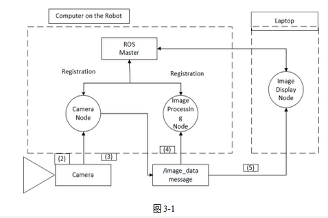 【问题 3】 (10 分)ROS 的架构定义了 ROS 系统由多个各自独立的节点(组件〉组成,并且各个节点之间可以通过发布/订阅(Pu blish/Subscribe )消息模型进行通信。图 3-1 给出一个简单机器人结构实例,请根据以下文字描述,补充图 3-1 中(1)-(5) 处空白,将答案写在答题纸上。"机器人开始阶段,所有节点都要注册 (Registration) 到 Master 上,注册后,摄像 头节点声明它要发布(Pu blish)一个叫做 limage_data 的消息。另外两个节点〈图像处理处理节点和图像显示节点〉声明它们需要订阅( Subscribe) 这个 image _data 消息。因此, 一旦摄像头节点收到相机发送的数据(Data),就立即将数据image_data直接发送到另外两个节点。