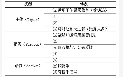 阅读以下关于机器人操作系统架构的描述,回答问题 1 至问题 3【说明】随着人工智能技术的发展,工业机器人已成为当前工业界的热点研究对象。某宇航设备公司为了扩大业务范围,决策层研究决定准备开展工业机器人研制新业务。公司将论证工作交给了软件架构师王工,王工经过分析和调研,从机器人市场现状、领域需求、 组成及关键技术和风险分析等方面开展了综合论证。论证报告指出:首先,为了保障本公司机器人研制的持续性,应根据领域需求选择一种适应的设计架构:其次,为了规避风险,公司的研制工作不能从零开始,应该采用国际开源社区所提供机器人操作系统 (Robot Operating System ,ROS)作为机器人开发的基本平台。在讨论会上,架构师李工提出不同意见,他认为公司针对宇航领域已开发了某款嵌入式实时操作系统,且被多种宇航装备使用,可靠性较高。因此应该采用现有架构体系作为机器人的开发平台。会上王工说明了机器人操作系统与该款操作系统的差别,要沿用需要进行改造,技入较大。经过激烈讨论,公司领导同意了王工采用 ROS 的意见。 【问题 1】 (5 分)王工拟采用的 ROS 具有分布式进程框架,以点对点设计以及服务和节点管理器方式, 使得执行程序可以各自独立地设计,松散地、实时地组合起来。这些进程可以按照功能包和功能包集的方式分组,因而可以容易地分享和发布。请用 400 字以内文字说明 ROS 与嵌入式实时操作系统的共同点,以及在实时性和任务通信方式两个方面的差异。【问题 2】 (10 分)ROS 为应用程序问通信提供了主题(Topic) 、服务 (Service)和动作 (Action) 三种消息通信方式,每种通信方式都有其特点。请将以下给出的三类通信的主要特点填入表 3-1 中(1)-(5) 的空白处,将答案写在答题纸上。(a) 适合用于传输传感器信息〈数据流)(b) 能够知道是否渭南藏葫斗川(c) 一对多模式(d) 有握手信号(e) 服务执行完会有反馈(f) 可以监控长时间执行的进程(g) 较复杂(h) 可能让系统过载(数据太多)(i) 服务执行完之前,程序会等待(j) 建立通信较慢(k) 可能丢失数据 表3-1 ROS三类通信的主要特点
