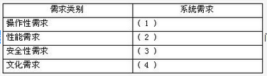 [问题1]系统性能需求( Performance Requirements) : 指响应时间、吞吐量、准确性、有效性、资源利用率等与系统完成任务效率相关的指标。可靠性、可用性等指标可归为此类。安全性需求( Security Requirements ) :系统向合法用户提供服务并阻止非授权用户使用服务方面的系统需求。操作性需求( Operational Requirements) :与用户操作使用系统相关的一些需求 。文化需求( Cultural Requirements) : 带有文化背景因素的系统需求。[问题2](1) (a) (b)(2) (c)(d)(f)(3) (e) (g)(4) (h)[问题3]b,c,h(此题不严谨)