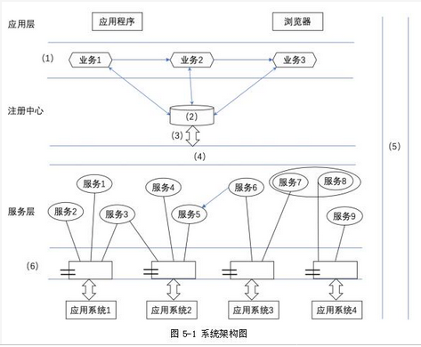 请从(a) ~ (j) 中选择相应内容填入图5-1的(1) ~ (6) ,补充完善架构设计图。(a)数据层(b)界面层(c)业务层(d) bind(e) 企业服务总线ESB(f)XML(g)安全验证和质量管理(h)publish(i) UDDI(j)组件层(k)BPEL