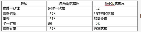 【问题1】10分请比较关系数据库与 NoSQL 数据的特点,如表 4-1 所示,以此来说明该系统更适合采用 NoSQL 数据库。请完成表 4-1 中的(1) ~ (5) 处空白。表 4-1 关系数据库与 NoSQL 数据库特征比较