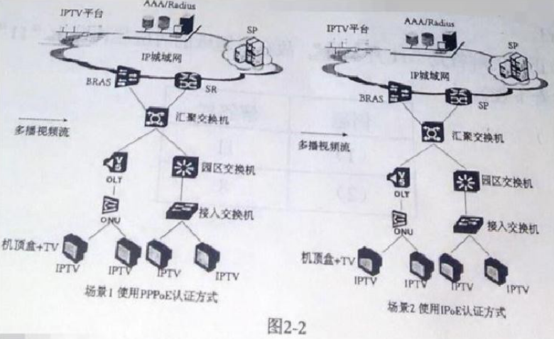(1)请在图2-2中分别完成PTV使用PPPoE和IPoE认证方式时多播视频流的流向和流数,并予以简单说明(其中,采用IPoE时多播复制点选择在园区交换机和OLT上)。