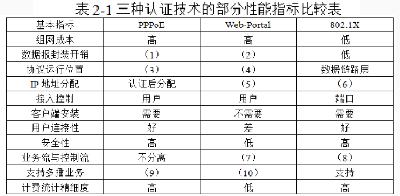 问题1: 1.高 2.低 3.数据链路层 4.应用层 5.认证前分配6.认证后分配 7.分离 8.分离 9.不支持 10.支持 问题2 PPPoE的认证机制较复杂,对设备的处理能力, 内存资源等要求较高。而传统的BRAS不是多业务承载的,所以在设备的扩展性,可靠性等方 面不足。 IPoE认证涉及到用户设备,网络业务系统等,并不是简单的支持dhcp。并且IPoE认证不是点对点的通信,必须解决的关键问题是安全问题,目前标准不统一的问题。 问题3:(1)利用BRAS作为PPPoE的边缘控制设备,业务路由器SR作为使用 IPoE的IPTV、流媒体等关键业务的边缘控制设备,形成多边缘的网络 架构。 (2)多边缘优点在接入规模发展后,大大降低设备成本。IPTV 和上网业务在核心和汇聚层走不同的通道,减 少上网流量对IPTV的影响 缺点:不同业务由不同设备接入,并且在汇聚 层对流量分离,使结构,功能更复杂。 单边缘优点:宽带上网和IPTV都由BRAS统一接 入,初期实现简单。 缺点:后期BRAS承受压力过大,不能持续发展。 问题4:在业务发展初期,可以使用PPPoe的方 式处理,网络改动小。在发展后期,选 择IPoE方式,上网流量和IPTV流量分别接入,满足网络的性能和服务质量。 【解析】 问题1: 1.高 2.低 3.数据链路层 4.应用层 5.认证前分配6.认证后分配 7.分离 8.分离 9.不支持 10.支持 问题2 PPPoE的认证机制较复杂,对设备的处理能力, 内存资源等要求较高。而传统的BRAS不是多业务承载的,所以在设备的扩展性,可靠性等方 面不足。 IPoE认证涉及到用户设备,网络业务系统等,并不是简单的支持dhcp。并且IPoE认证不是点对点的通信,必须解决的关键问题是安全问题,目前标准不统一的问题。 问题3:(1)利用BRAS作为PPPoE的边缘控制设备,业务路由器SR作为使用 IPoE的IPTV、流媒体等关键业务的边缘控制设备,形成多边缘的网络 架构。 (2)多边缘优点在接入规模发展后,大大降低设备成本。IPTV 和上网业务在核心和汇聚层走不同的通道,减 少上网流量对IPTV的影响 缺点:不同业务由不同设备接入,并且在汇聚 层对流量分离,使结构,功能更复杂。 单边缘优点:宽带上网和IPTV都由BRAS统一接 入,初期实现简单。 缺点:后期BRAS承受压力过大,不能持续发展。 问题4:在业务发展初期,可以使用PPPoe的方 式处理,网络改动小。在发展后期,选 择IPoE方式,上网流量和IPTV流量分别接入,满足网络的性能和服务质量。