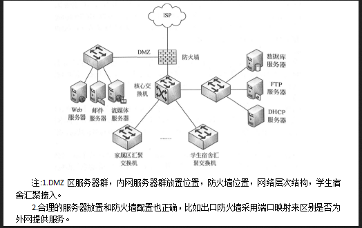 根据问题1对该学校网络区域的划分,将不同的服务器放置在相应的区域即可,对于具体的网络连接细节则不必过多地考虑,在防火墙的DMZ区中,由于需要连接多台服务器,应使用一台局域网交换机进行连接。