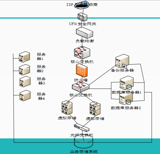 图2-1为某企业数据中心拓扑图,图中网络设备接口均为千兆带宽,服务器1至服务器4均配置为4颗CPU、256GB内存、千兆网卡。实际使用中发现服务器使用率较低,为提高资产利用率,进行虚拟化改造,拟采用裸金属架构,将服务器1至服务器4整合为一个虚拟资源池。图中业务存储系统共计50TB,其中10TB用于虚拟化改造后的操作系统存储,20TB用于Oracle数据库存储,20TB分配给虚拟化存储用于业务数据存储。