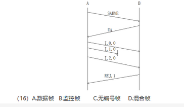 站点A与站点B采用HDLC进行通信,数据传输过程如下图所示。建立连接的SABME帧是_(16)。在接收到站点B发来的“REJ,1"帧后。站点A后续应发送的3个帧是(17)帧。