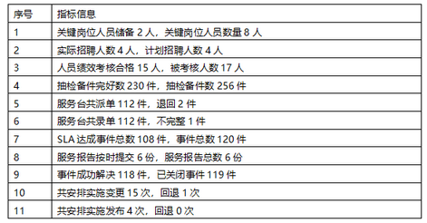 参考答案:【问题1】人员要素:人员储备与连续性管理;人员能力评价与管理;人员绩效管理;人员培训计划执行;资源要素:工具管理;知识管理;服务台管理与评价;备品备件管理技术要素:技术研发规划;技术研发预算;技术成果的运行与改进过程要素:服务级别管理;服务报告管理;事件管理;问题管理;配置管理;变更管理;发布管理;安全管理;连续性和可用性管理;容量管理【问题2】(5分)包括:备件申请、采购、到货入库、领用、报废【问题3】(6分)人员招聘达成率:(实际招聘人数/计划招聘的人数)*100%:4/4*100%=100%备件可用率:(定期检查备件完好数量/定期抽检备件总数)*100%:230/256*100%=89.84%服务台派单成功率:【1-(退回的派单/派单总数)】*100%:(1-(2/112))*100%=98.21%SLA达成率:(SLA达成事件之和件总数)*100%:108/120*100%=90.00%事件解决率:(解决事件/已关闭事件总数)*100%:118/119*100%=99.15%变更成功率:1-(回退变更/变更总数)*100%:1-(1/15)*100%=93.33%